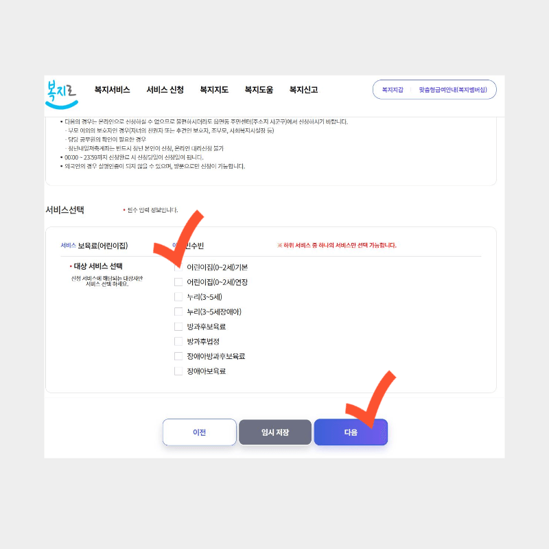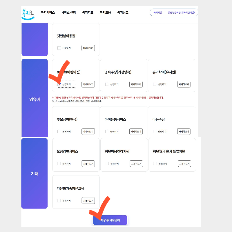 2. 로그인이 끝나면 서비스신청 밑에 복지급여 신청으로 들어갑니다. 그다음 영유아 항목에서 보육료(어린이집) 신청하기를 선택하고 저장 후 다음단계로 넘어갑니다.