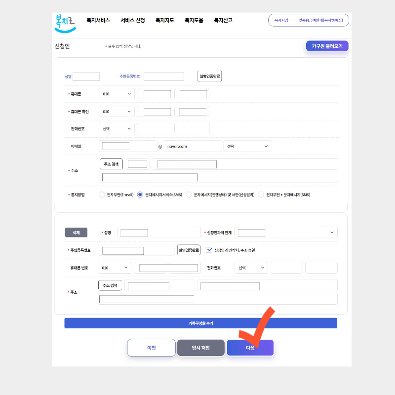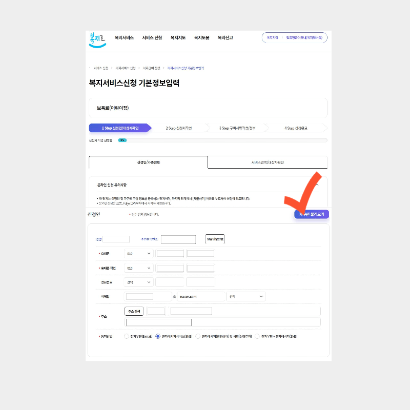 3. 그럼 기본정보입력란이 나오는데 가구원 불러오기를 누르면 간편하게 대부분의 정보가 자동으로 입력됩니다. 추가로 입력해야 하는 사항은 없는지 한번 더 확인해 주시고 넘어가세요. 그다음 대상 서비스 선택에서 자녀에 해당하는 항목을 체크하고 넘어갑니다. *통지 방법은 원하시는 방법으로 선택하면 됩니다. 저희는 문자를 선택했습니다.
