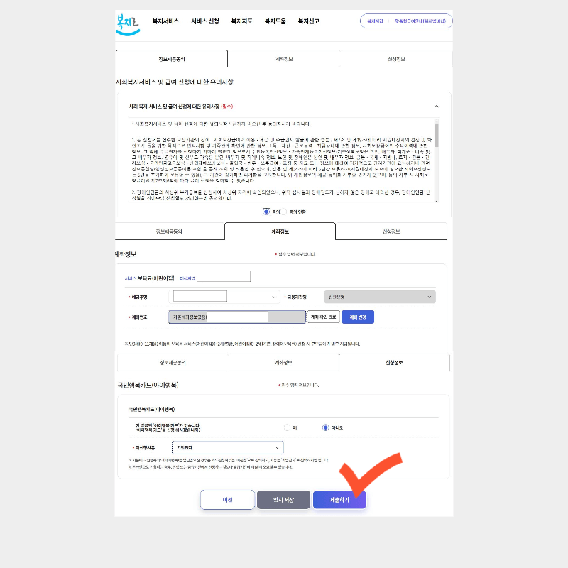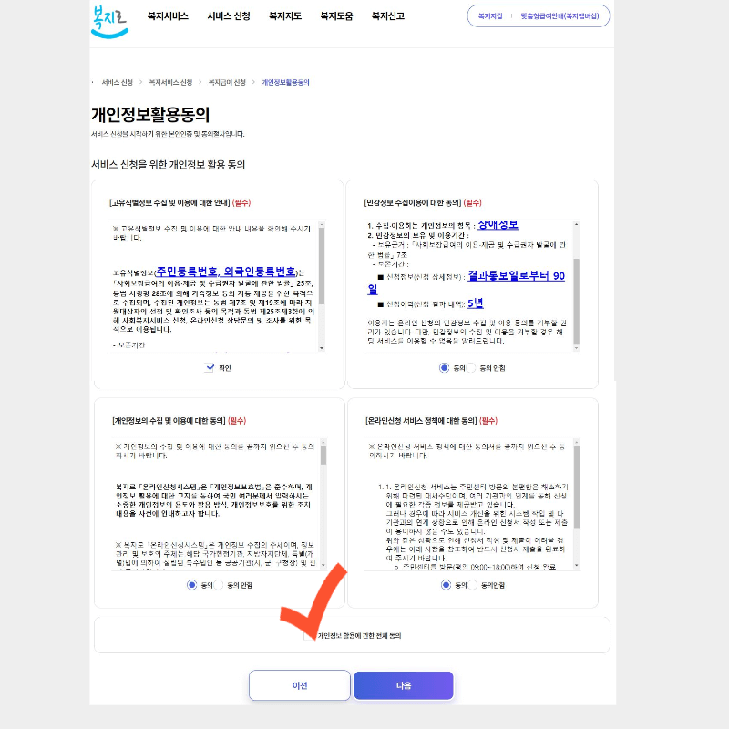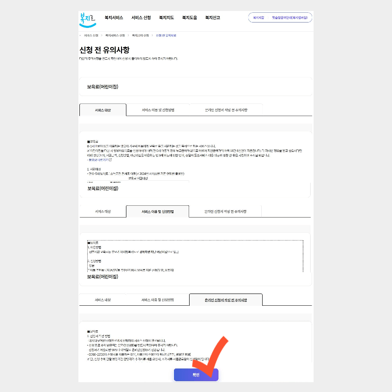 2. 그러면 개인정보활용동의 사항 확인하고 신청 전 유의사항으로 넘어갑니다. 여기서 서비스 대상, 이용 및 신청방법, 유의사항 세 가지 항목을 꼼꼼하게 살펴보시고 확인 눌러주세요.