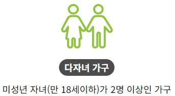다자녀 가구 : 미성년 자녀(만 18세 이하)가 2명 이상인 가구